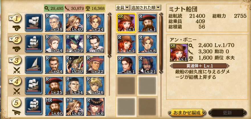 課金しなくても気長にやればSRでるってのは嬉しい反面、「いいのかそれで、運営!」と思うのもまた事実。いつかSRがでるなら別に課金しなくてもなぁ・・・。あーでも、SRこんなにつよいのかー、もうちょっとほしいかも・・・とおもわせて課金心をくすぐる手段なのかもしれない。 まぁでも、課金しなくても強い(?)航海士が手に入るのは正直嬉しいですな。