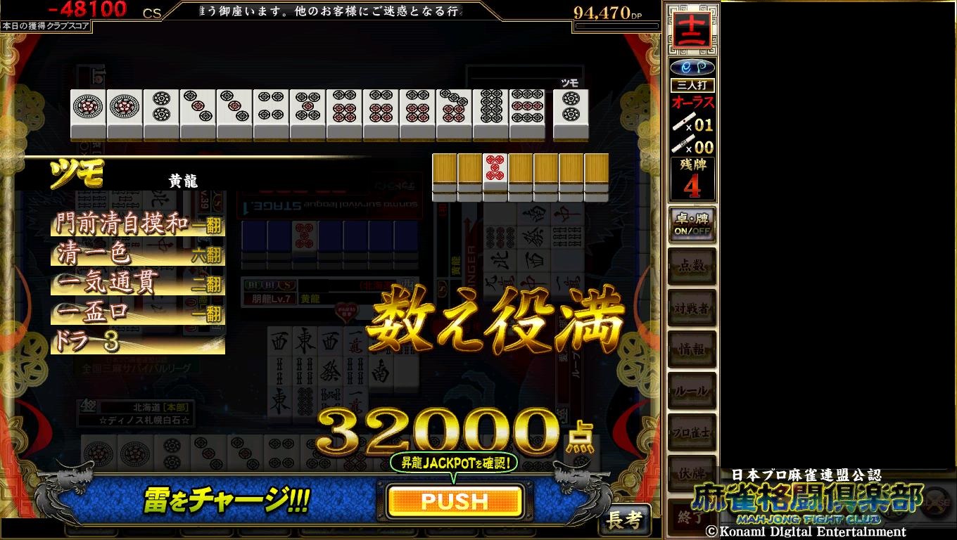 なんで2巡目で倍満ダマはってんだよ!!!ってことがままあります。まぁ、そこはKONAMIさまの大黄龍仕様ってことで自分を慰めておきますか。あと、残留とか昇格でたとたんに配牌がた落ちするのとかね、勘弁して欲しいです。まわしてまわして結局つもられ貧乏とかねー、やーめーてー。